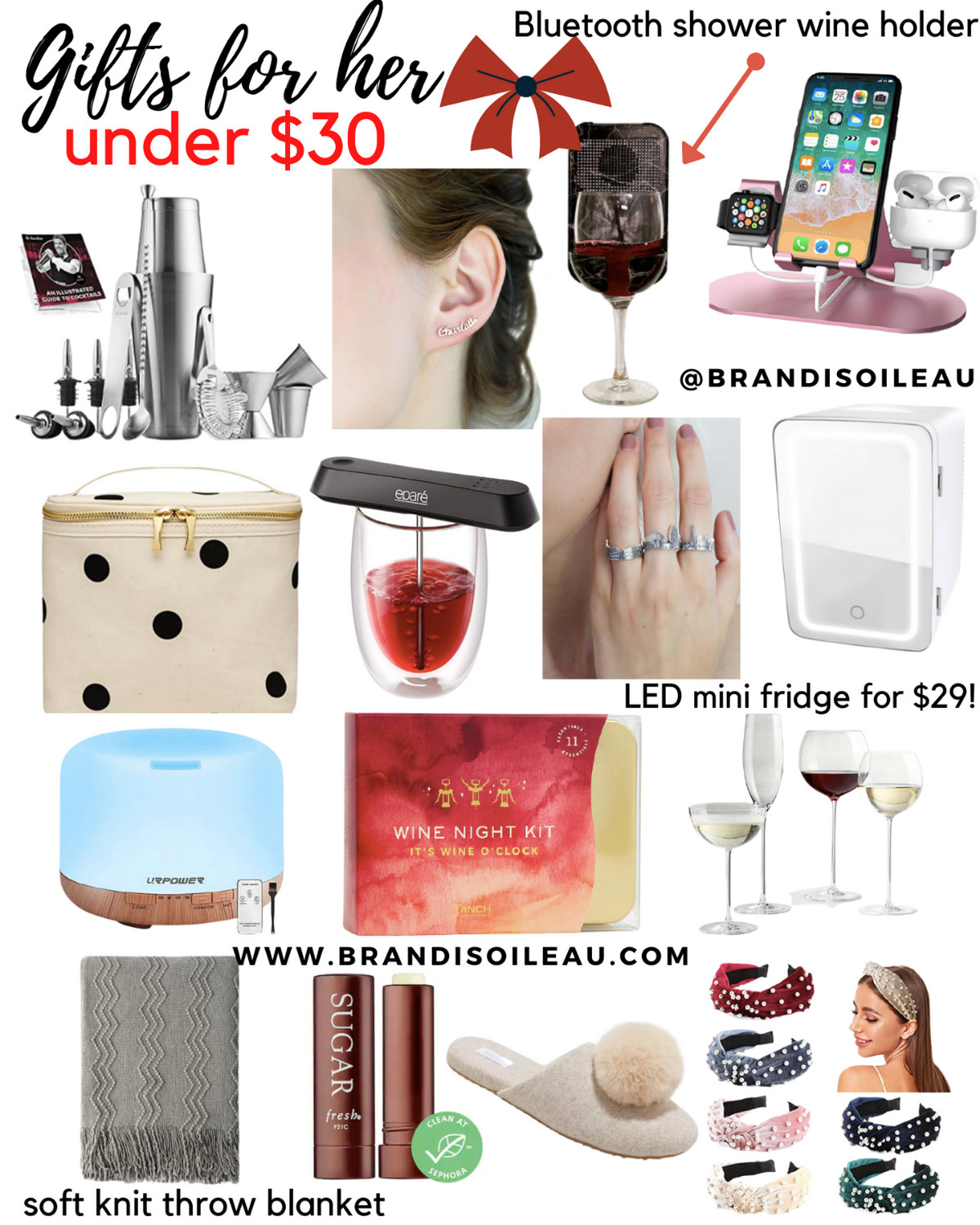 14 piece bar tools set // Personalized name earrings // Bluetooth shower wine holder // 3-in-1 charging dock // Kate Spade lunch tote (we bought this for Schuyler’s sis last year) // Pocket wine aerator // Custom city ring // LED mini fridge w/mirror door // Essential oil diffuser // Wine night kit // Long stem wine glasses // Soft knit throw blanket (+ tons of colors) // Sugar lip balm // Pom slippers // Knot pearl headbands