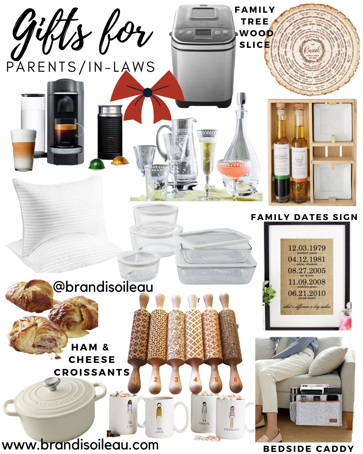 Nespresso + frother (MAJOR sale, $124.99 (save $163)) // Bread maker // Family tree wood slice art // Etched coupe glasses // Dipping Oil Set // Hotel gel pillows (2) // 10 piece Pyrex glass set // Family date sign // Williams Sonoma ham & cheese croissants // Design rolling pins set (6) // Le Creuset dutch oven // Personalized family mugs // Bedside/couch caddy