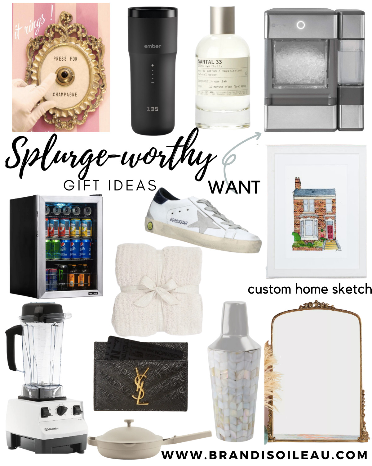Cute frame button (it rings!) // Ember travel mug (WANT) // Nugget ice maker (best price I’ve seen) // Beverage fridge // Golden Goose sneakers // Barefoot dreams ribbed throw // Custom house portrait // Vitamix blender (has been on my list) // YSL card holder // Always pan (have heard great things!) // Mother of pearl mosaic cocktail shaker // Gorgeous floor mirror